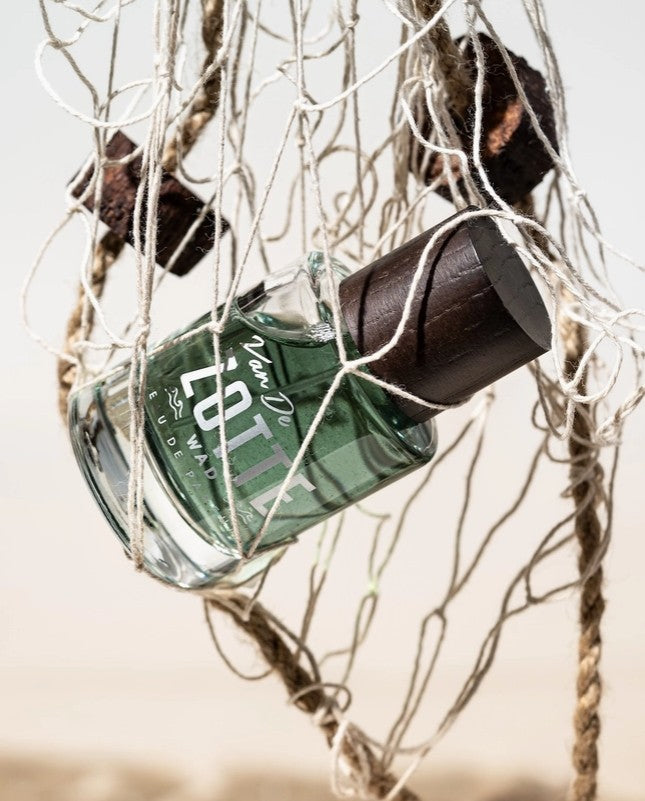 WAD è profumo sviluppato come tributo al mare di Wadden e alle sue isole, a nord dei Paesi Bassi. Dalla sabbia salata e le alghe marine che non possono sopravvivere senza le maree, all'olivello spinoso e ai pini delle isole. Catturare l'odore del Mare dei Wadden e trasformarlo in un profumo indossabile è stato un progetto impegnativo. È una bellezza ruvida, ma onesta e naturale che si fonde perfettamente. Lo apprezzerai di più una volta che lo conoscerai. Ciò che effettivamente si sente durante una passeggiata lungo le coste delle isole sono le alghe. Quindi questi sono tra gli ingredienti. C'è anche il bergamotto e la salvia sclarea per dare l'idea del sale. Sentirai l'odore del porto grazie ad una corda di sisal. Contiene anche una buona dose di oud e ambra grigia per quell'odore di spiaggia bagnata e ventosa. E ultimo ma non meno importante c'è ovviamente il pino, perché le isole ne sono ricoperte.